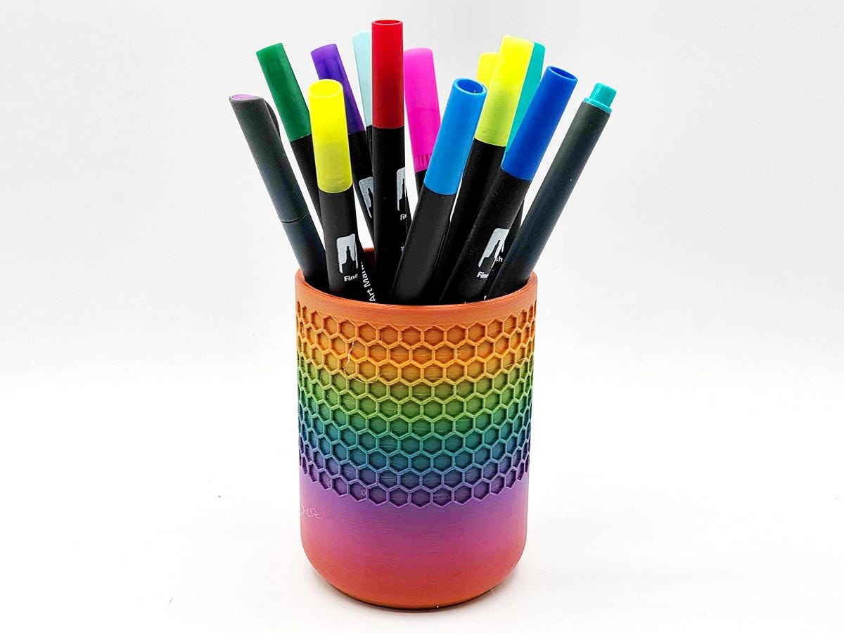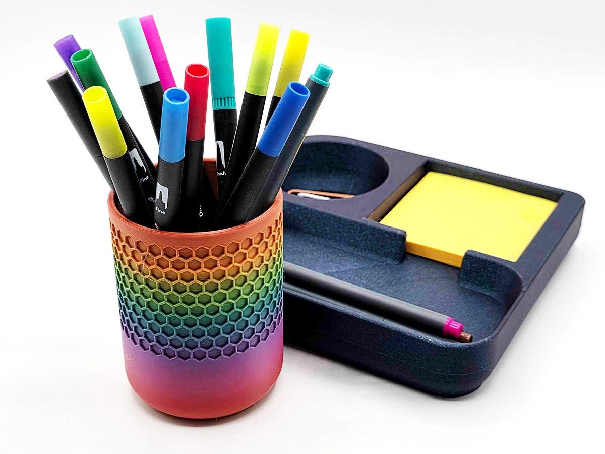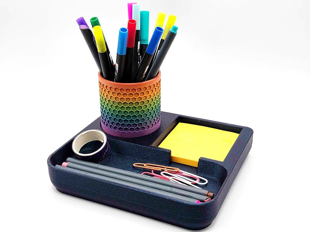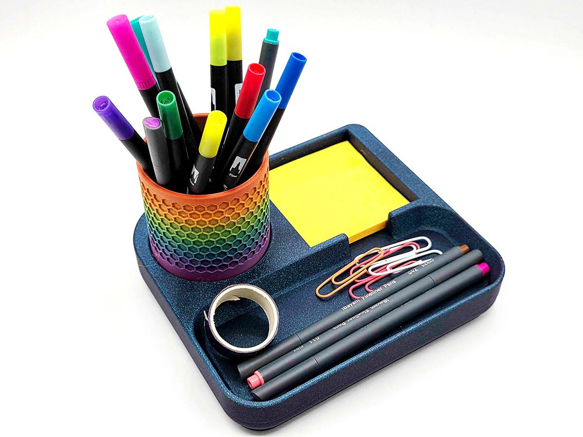 It also has space that perfectly matches the pen cup that comes with it! Printed with a honeycomb pattern, it's pretty and functional!
