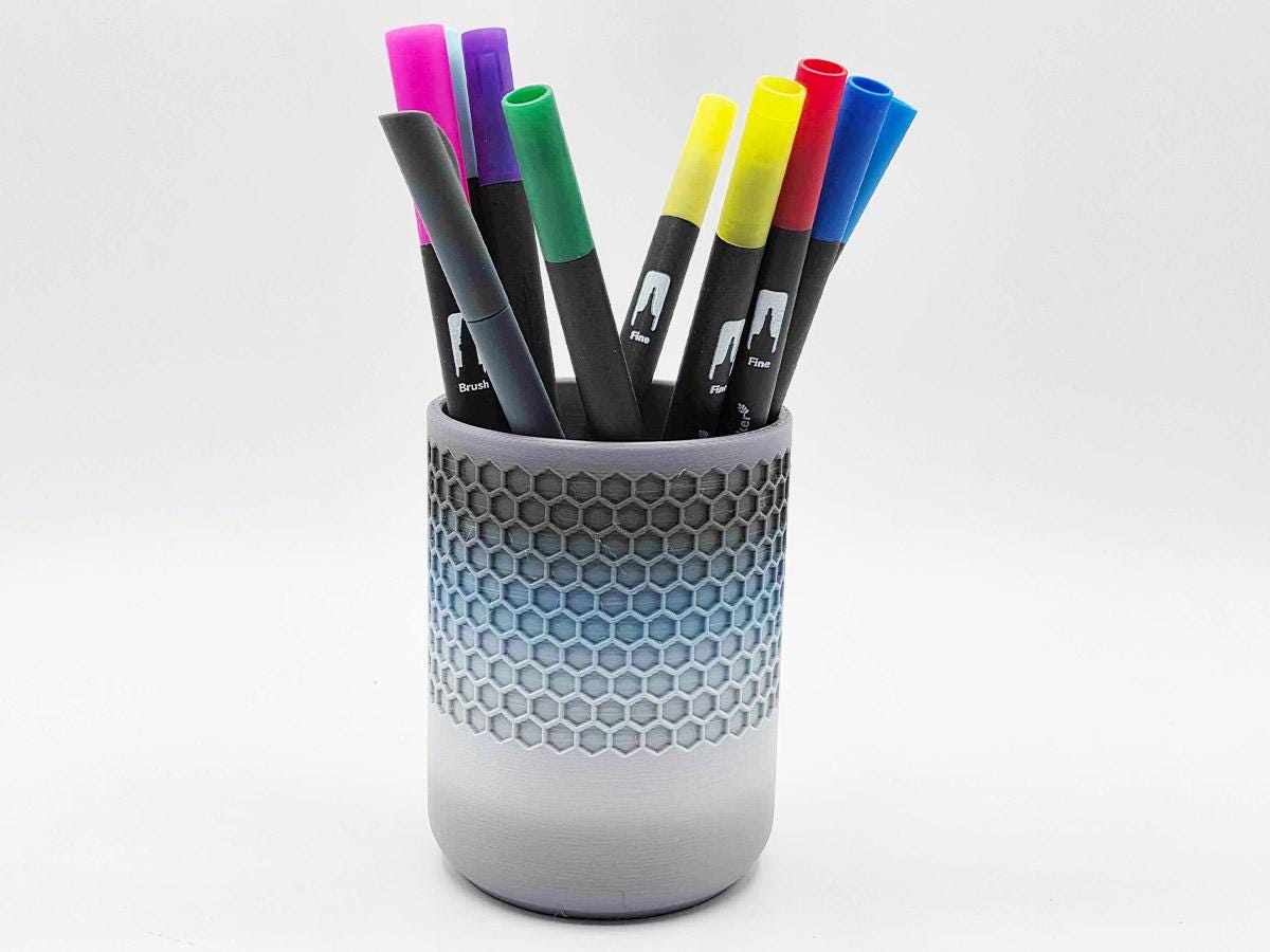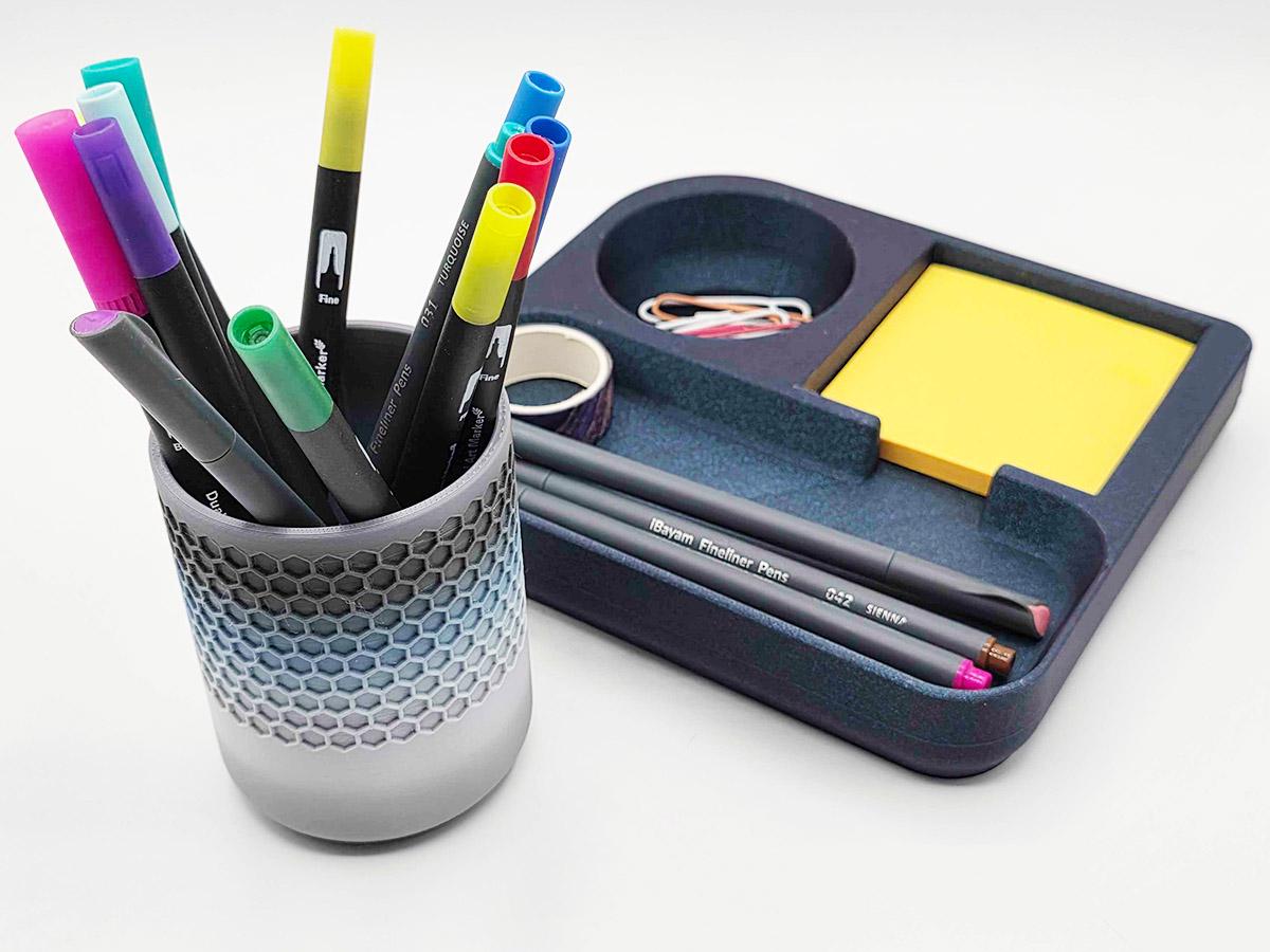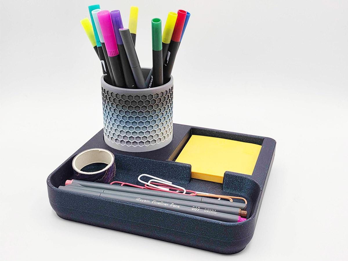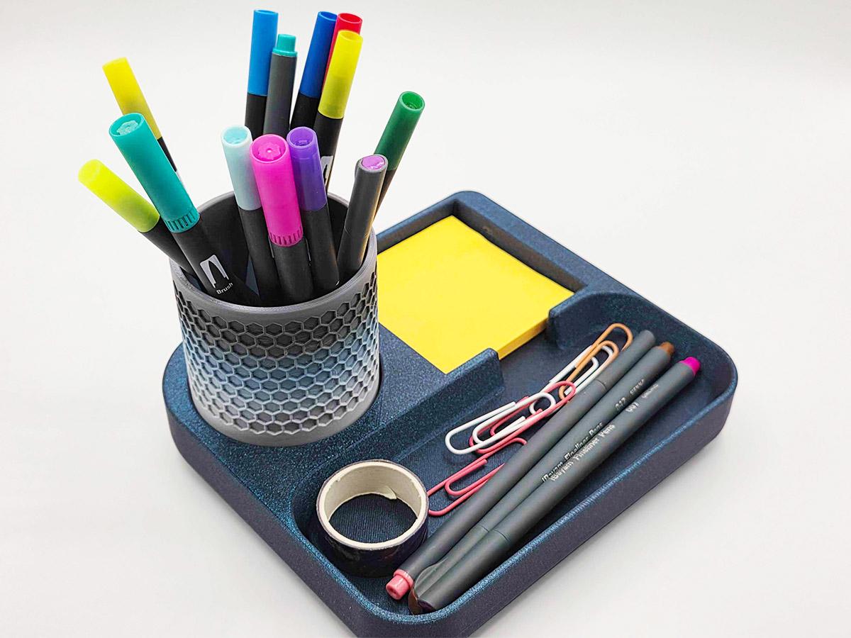 It also has space that perfectly matches the pen cup that comes with it! Printed with a honeycomb pattern, it's pretty and functional!