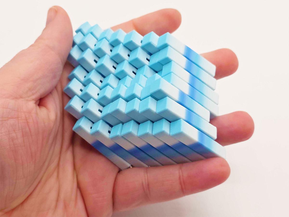 These fidget cubes are a handful! Made up of 49 interlocking rectangular columns, they expand, contract, twist and create new shapes. In cube form, it is roughly 2" x 2" x 1.5", but when you expand it to its fully diamond shape it is almost twice that size!