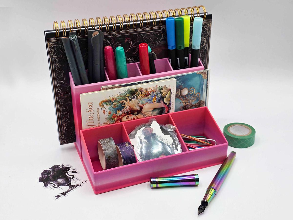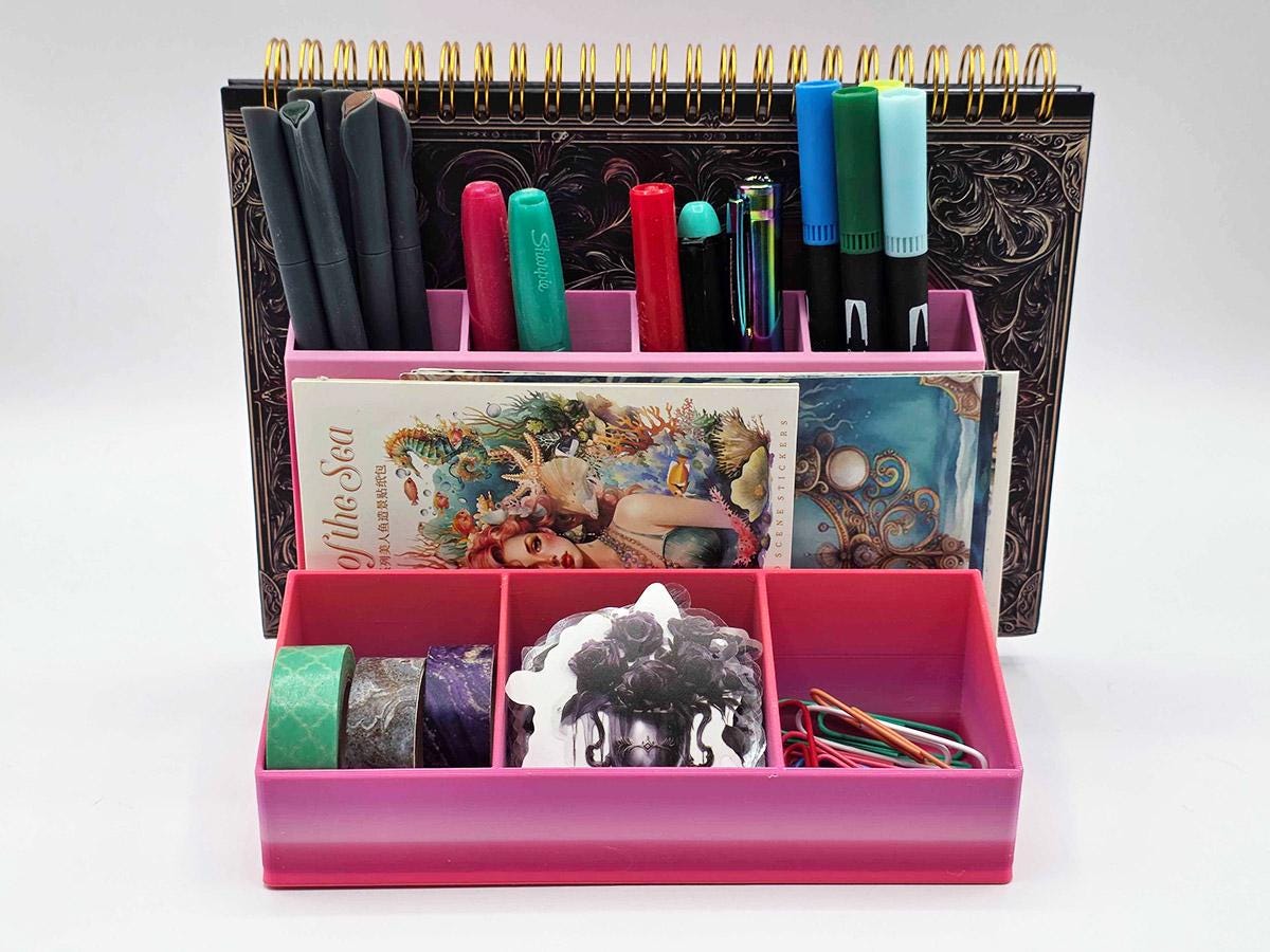 It has a slot in the back for a journal, four containers for pens and markers, a smaller slot designed for stickers, postcards, or sticky notes, and three cubbies in the front that can fit paperclips, washi tape, stickers, or anything small you need to keep organized!