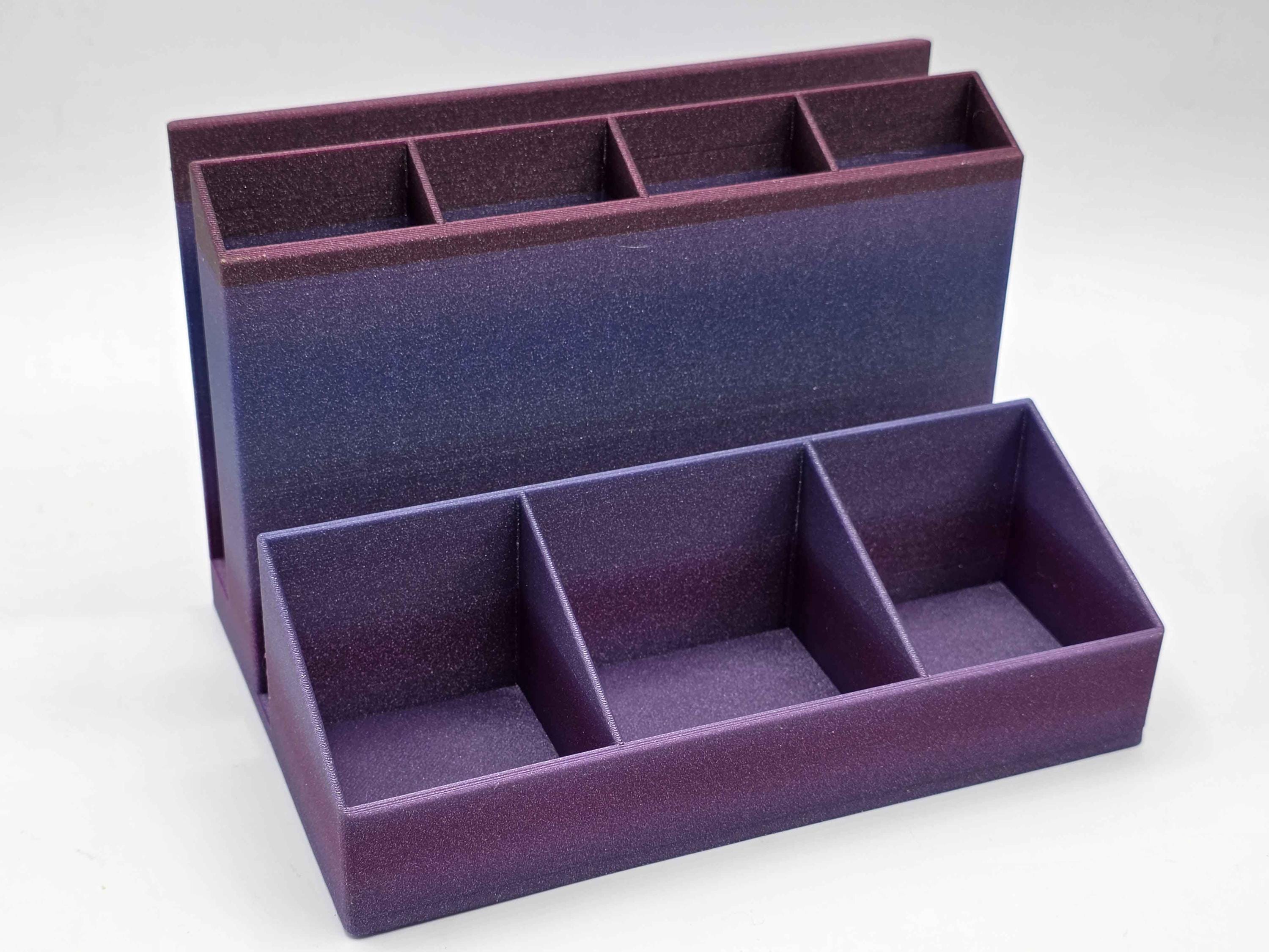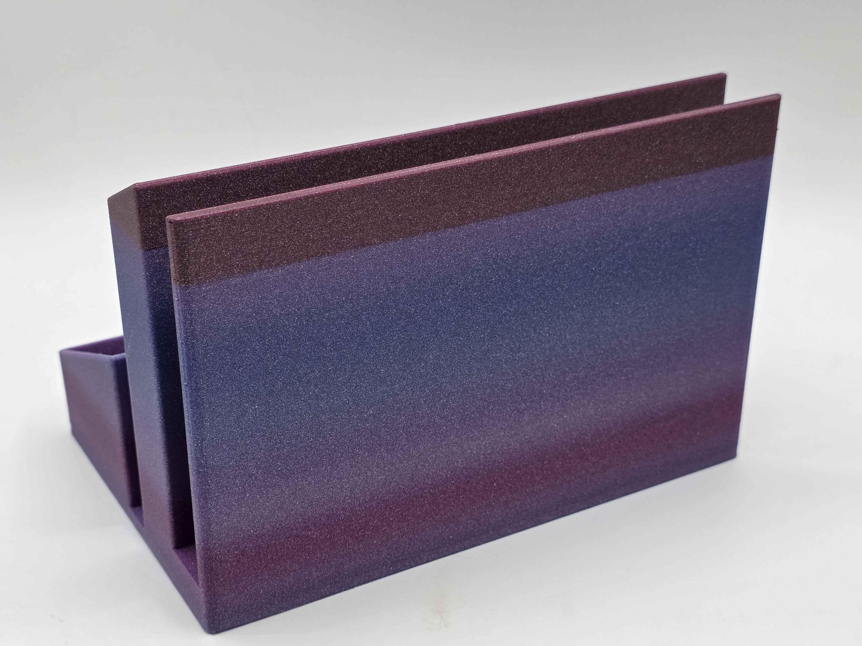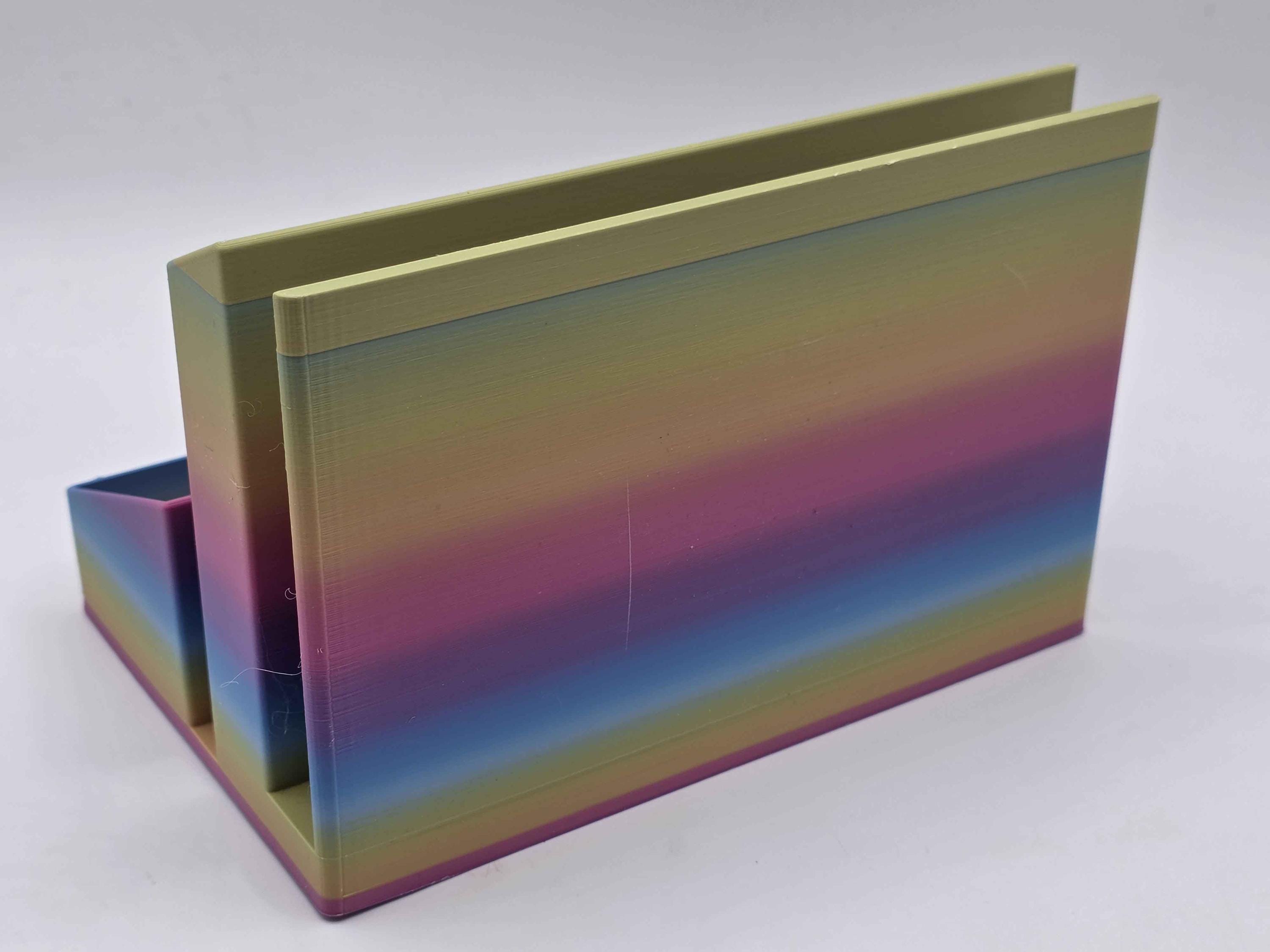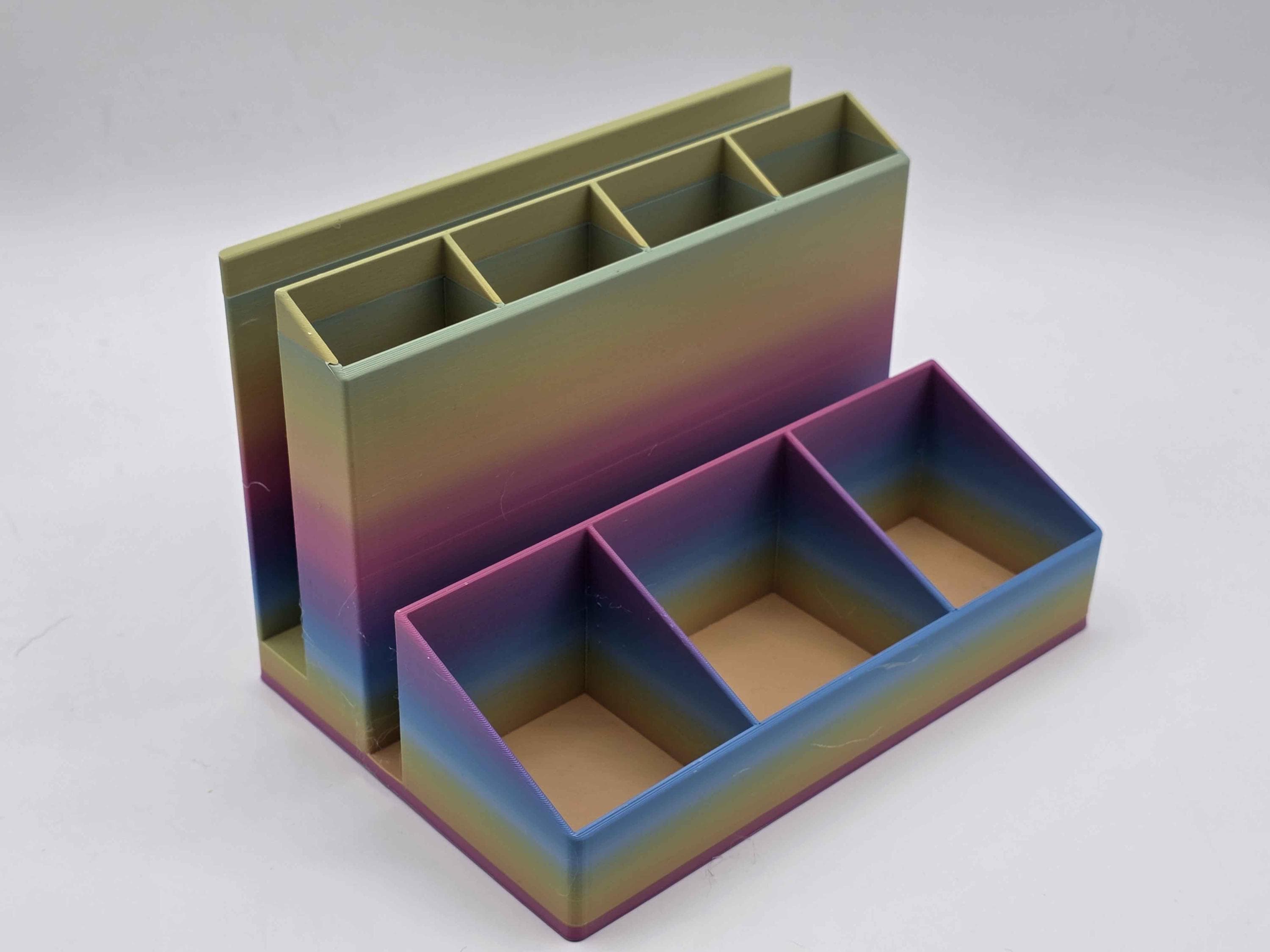 A basic organizer for your desk designed to hold a bullet journal or planner (5.5x8 or 6x9 fit best, but larger notebooks will probably work as well!) Because of the nature of gradients, your organizer may not have the colors start & stop on the same places on the organizer, but you will get the full color spectrum!