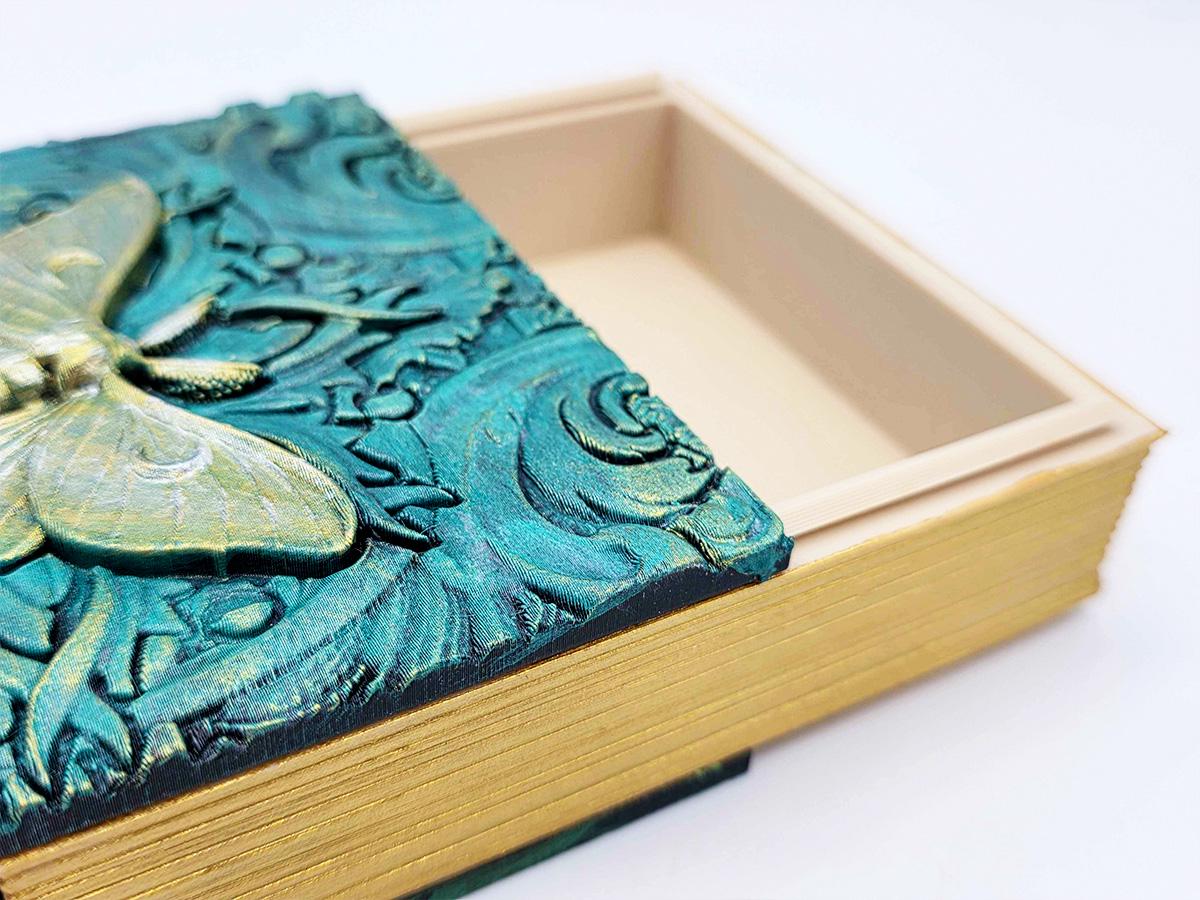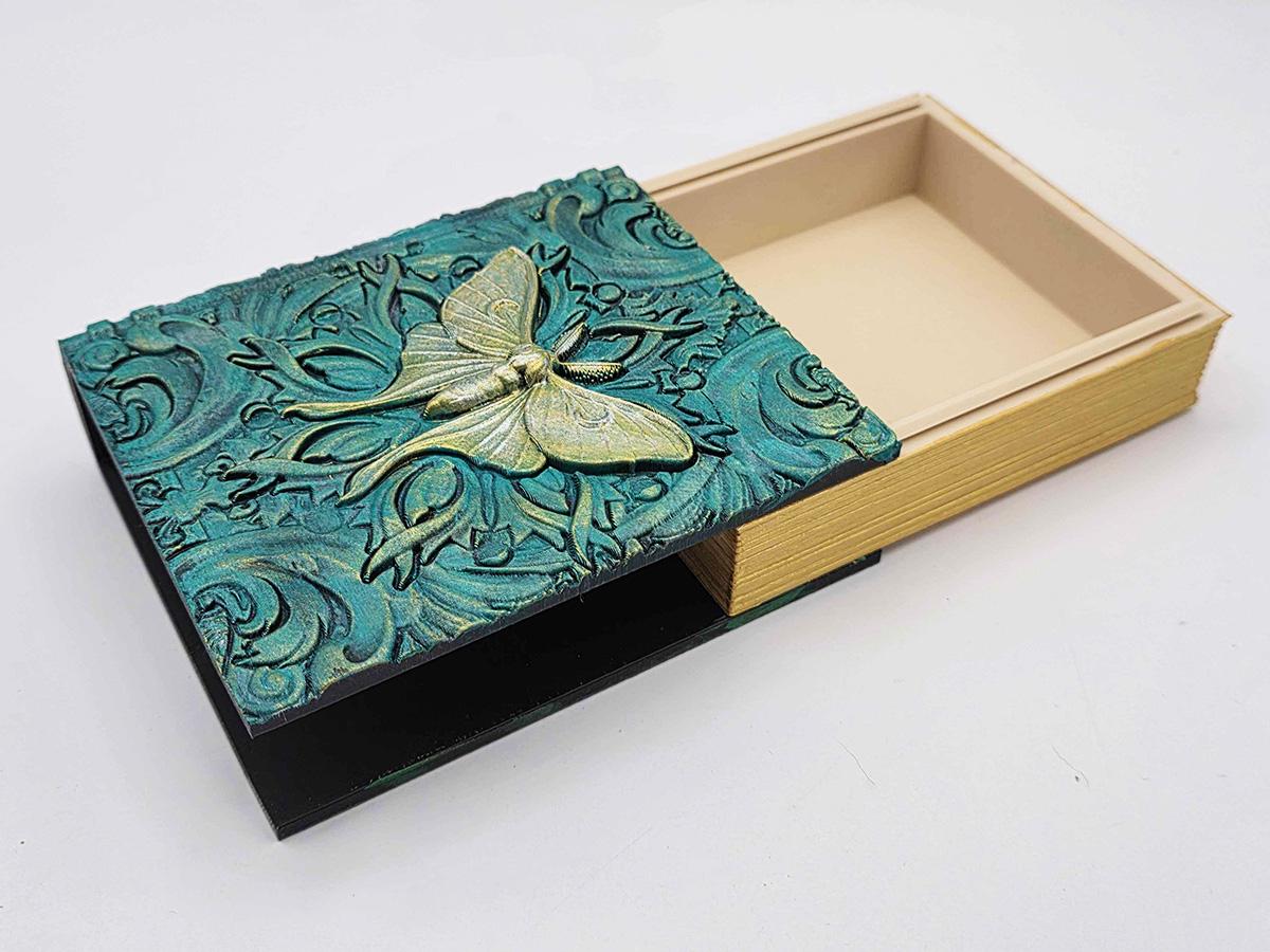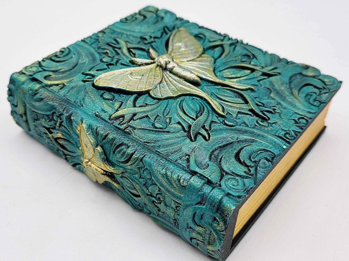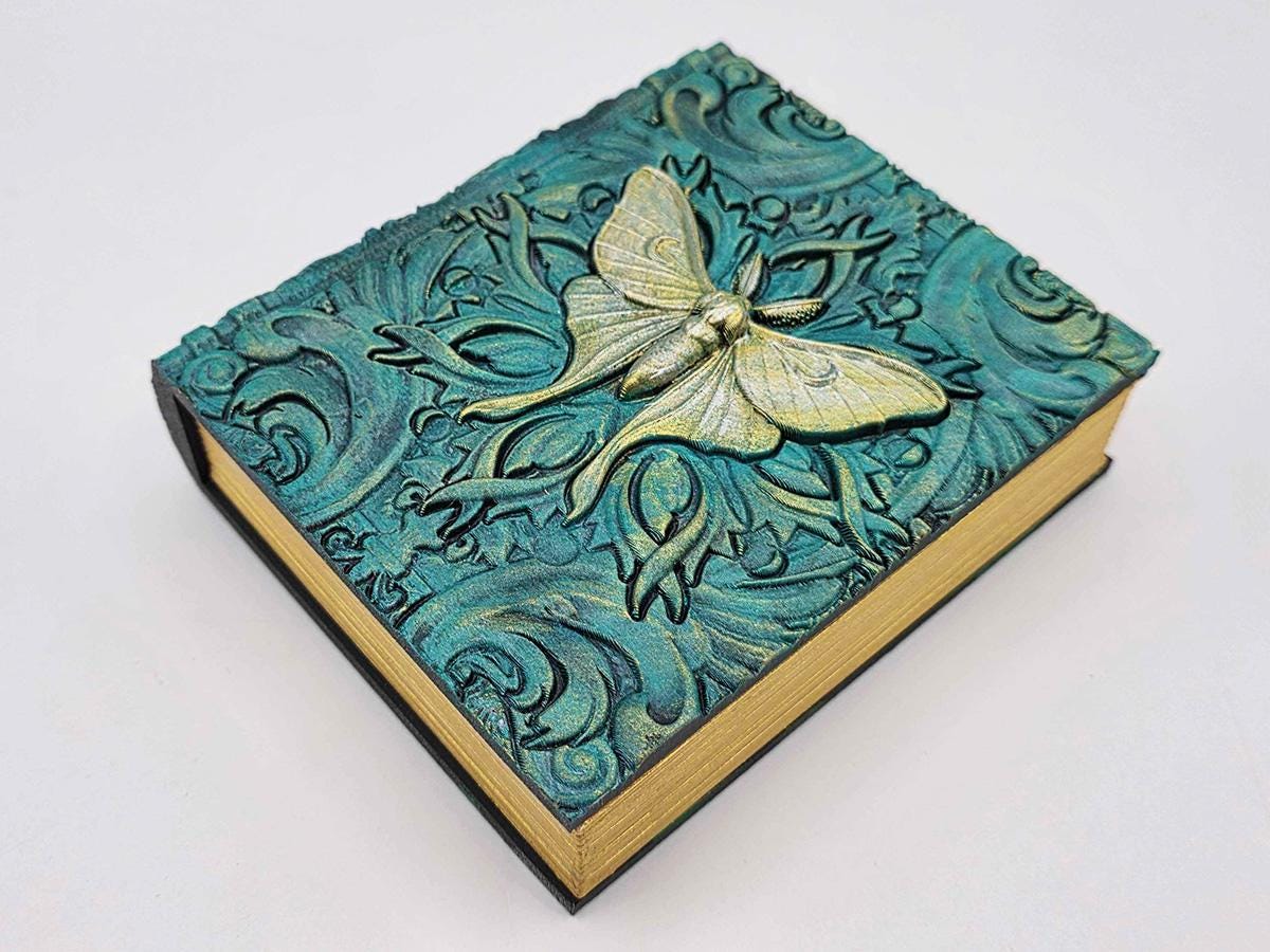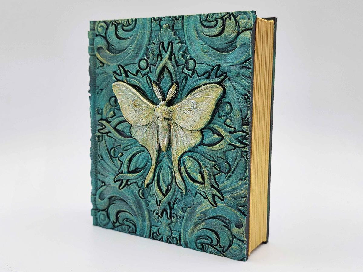 A melodramatic book deserves melodramatic pages, so the luna moth tomes have gilded edges.
