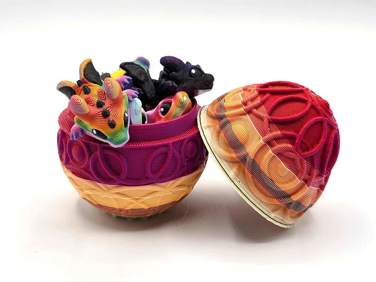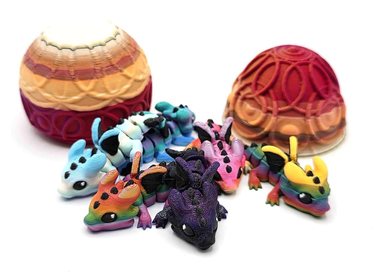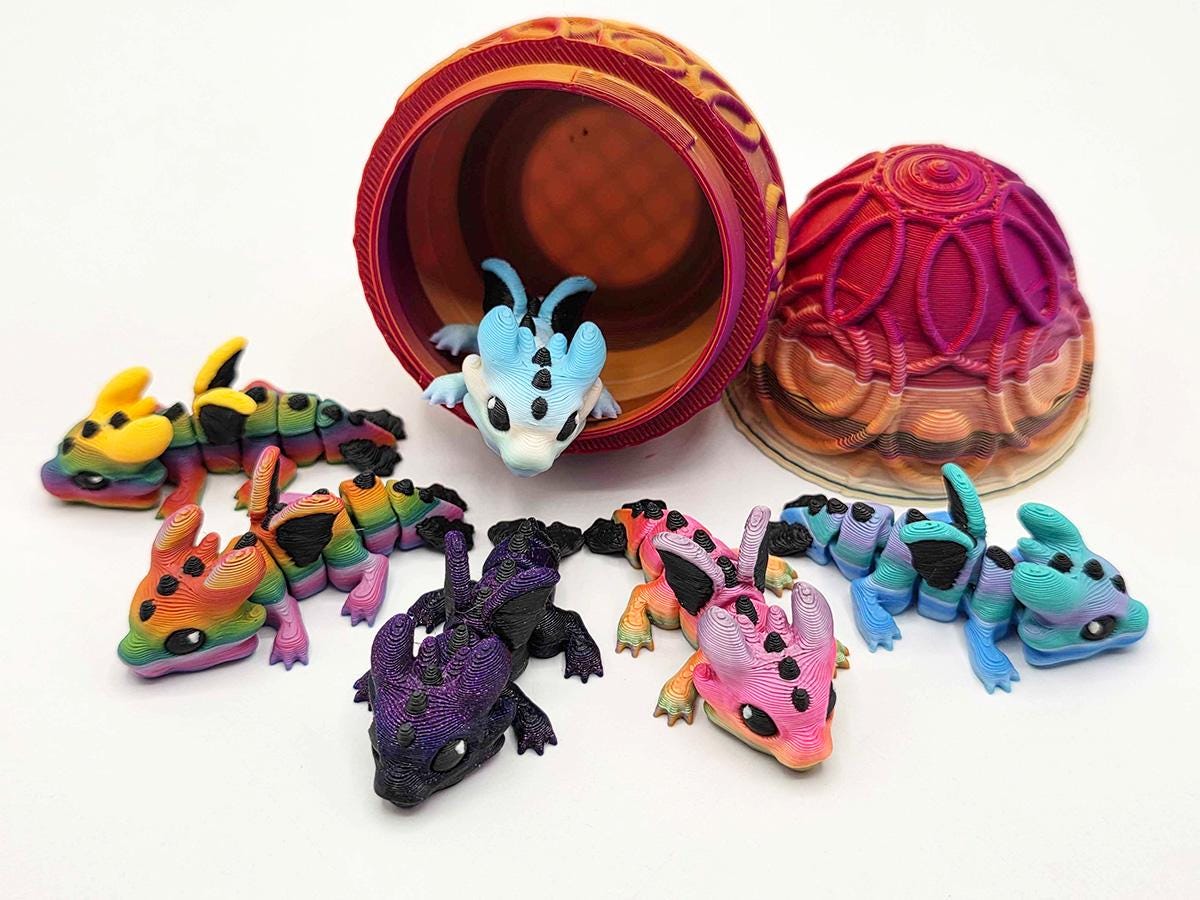 This listing is for 6 teeny tiny dragons. We'll do our best to make sure you have a selection of several different colors, but they will be completely random! They'll come packed into one of our mystery stripey colored eggs that are printed with filament that would otherwise go to waste during color changes!