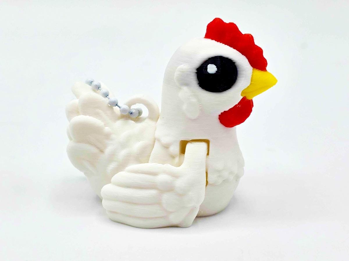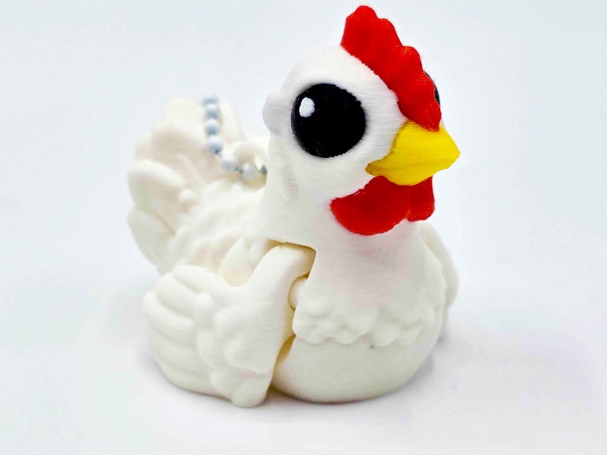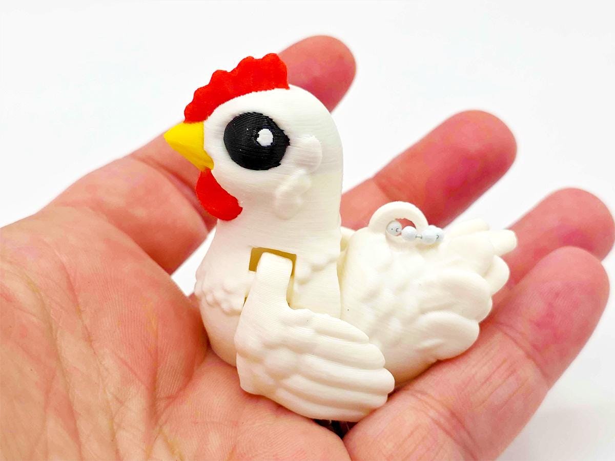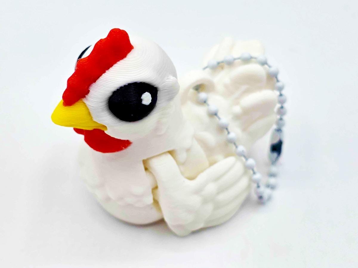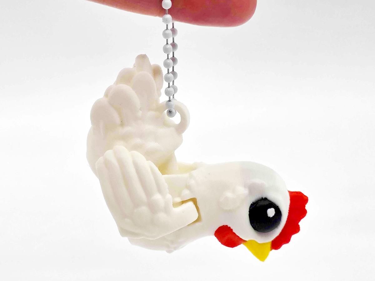 This keychain is a GIANT VERSION of our tiny chickens, printed in a delightful pastel. Because it's a larger version of a small thing, the articulation is quite dramatic, which means the body twists and the wings flap with great enthusiasm.