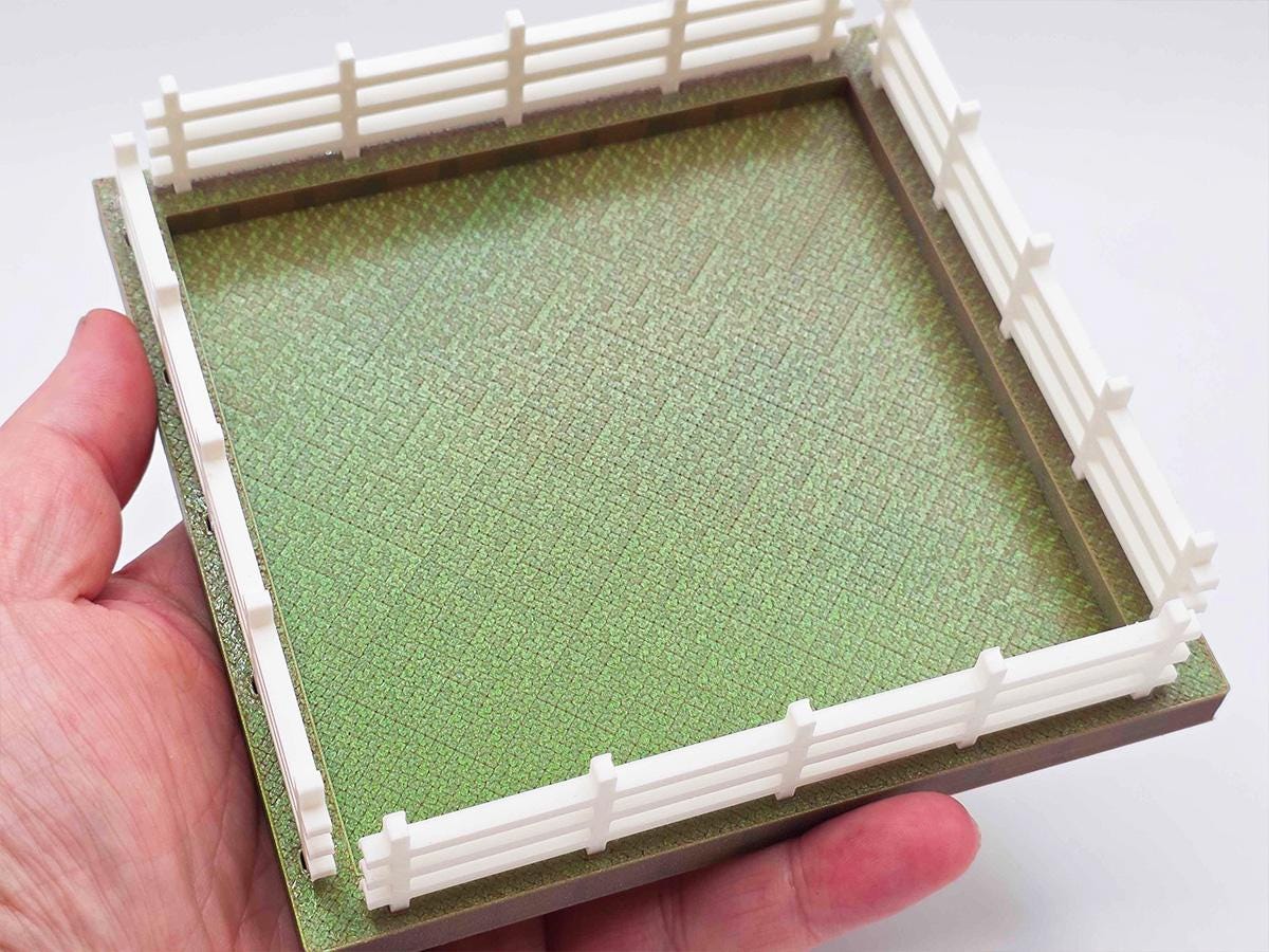The coop comes in a square yard printed with textured grass and surrounded by a white picket fence. Each set also comes with five adorable little chickens, each in a unique color.