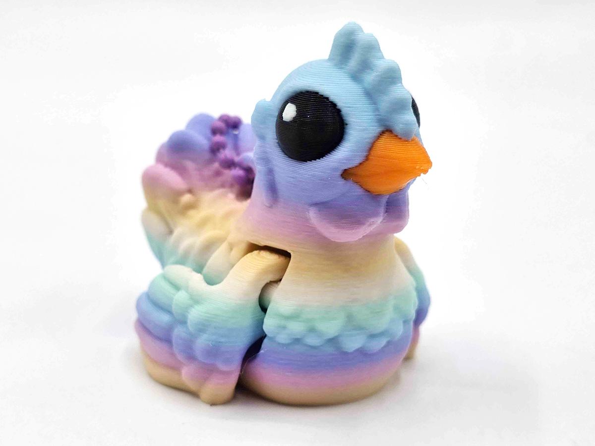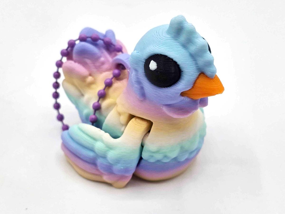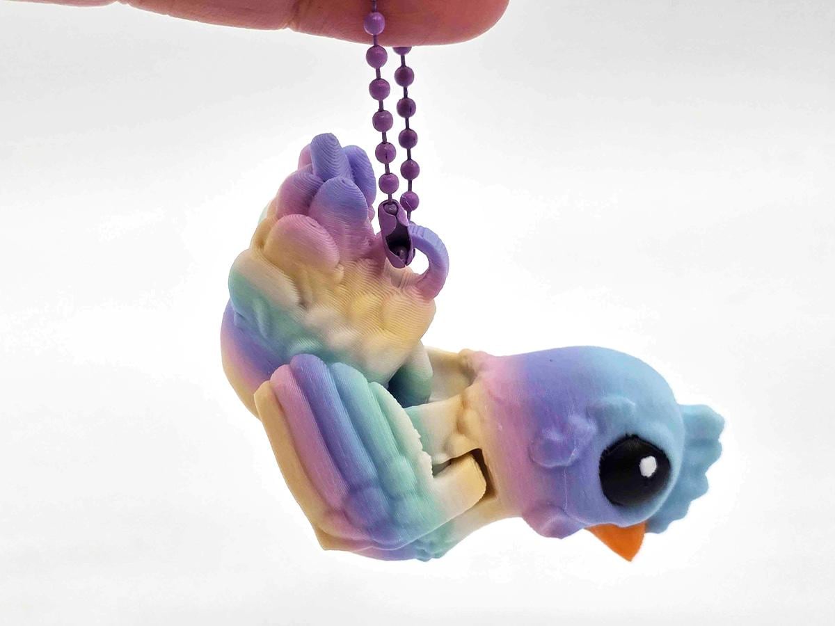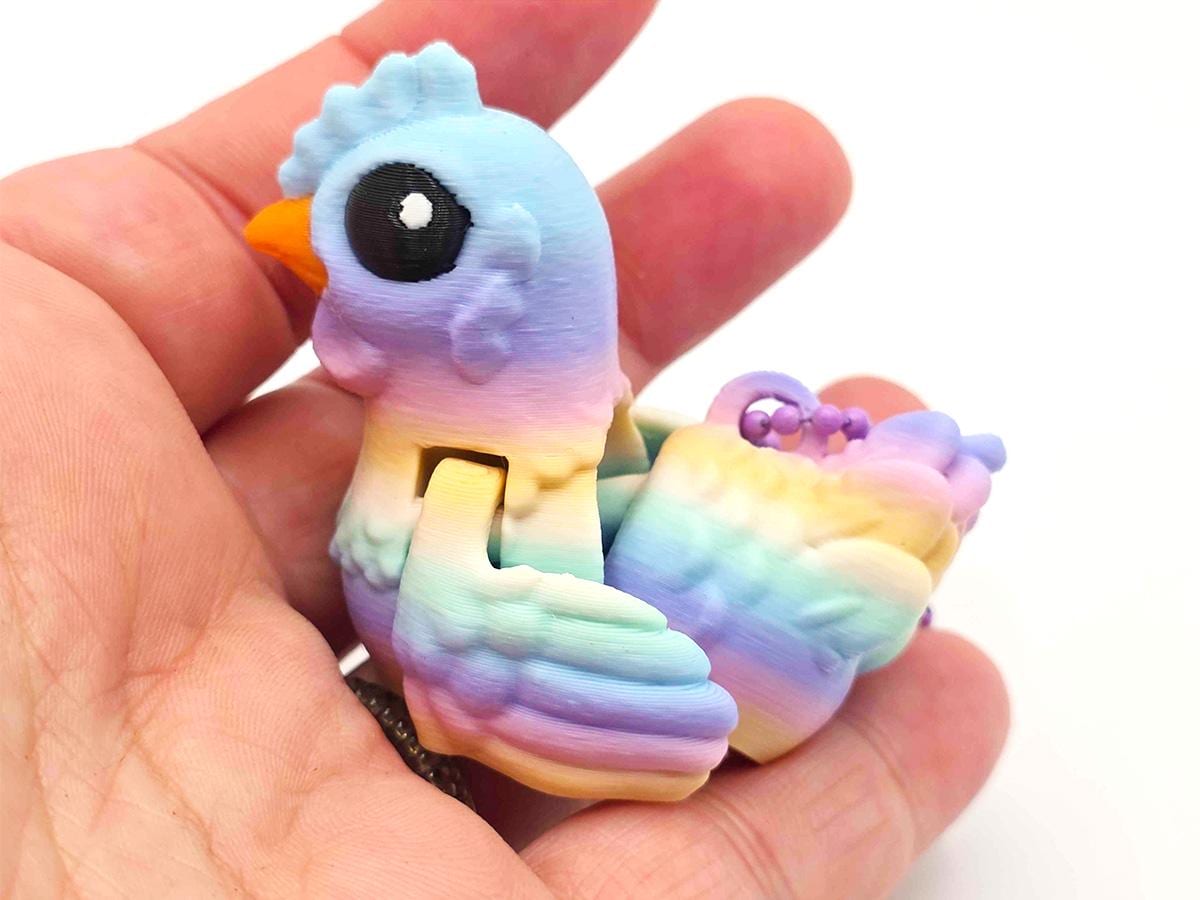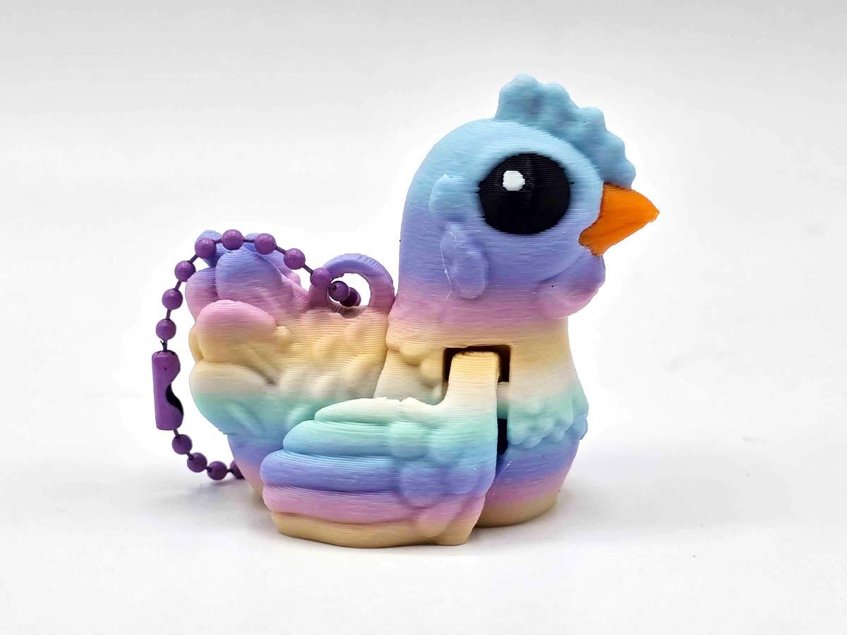 This keychain is a GIANT VERSION of our tiny chickens, printed in a delightful pastel. Because it's a larger version of a small thing, the articulation is quite dramatic, which means the body twists and the wings flap with great enthusiasm.